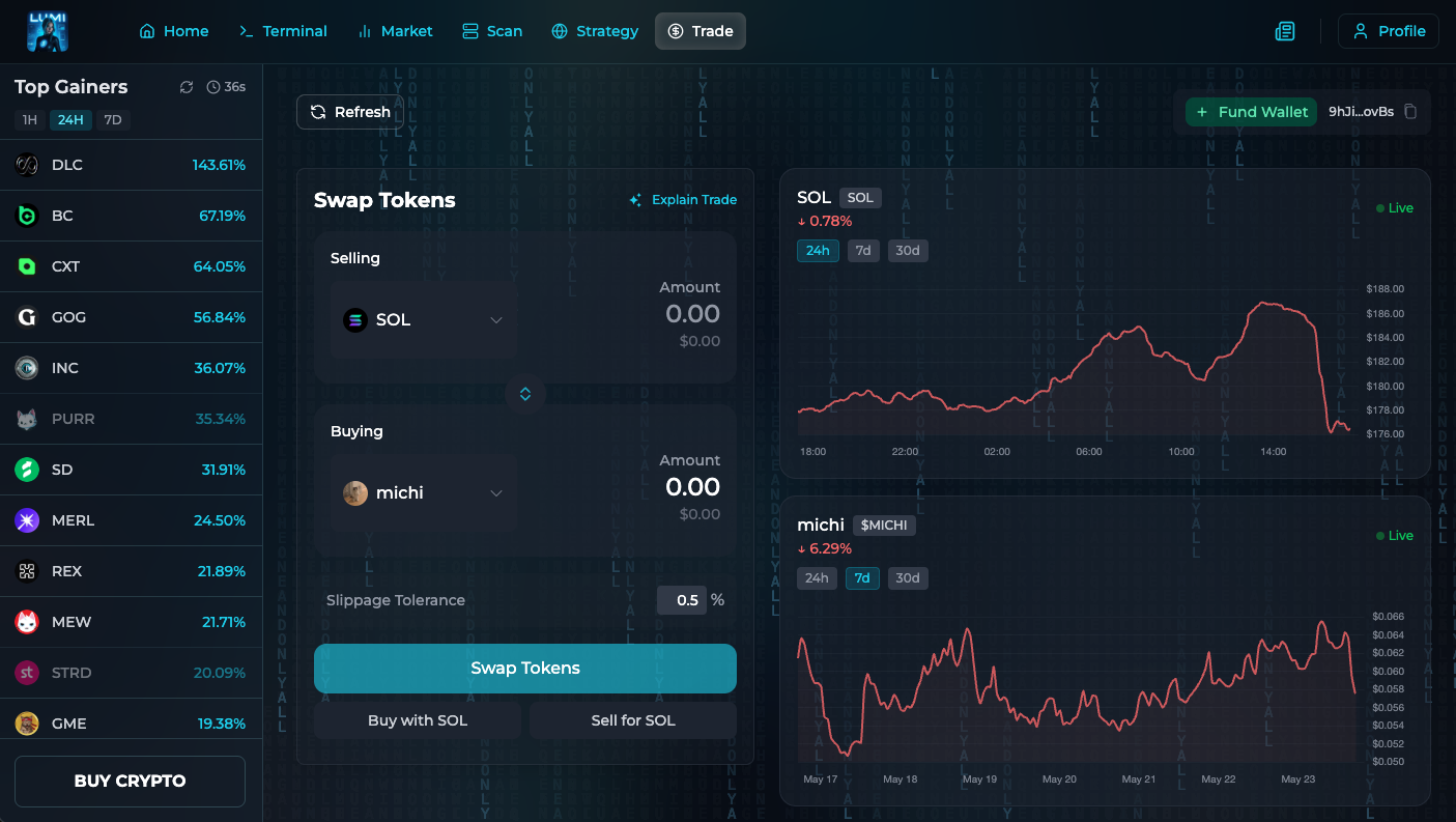 The LUMI Terminal is your AI-powered command center for everything crypto. Trade directly through the chat console or use one-click buttons to execute with speed and precision. LUMI handles the routing, slippage, and analysis — so you can focus on the strategy.
